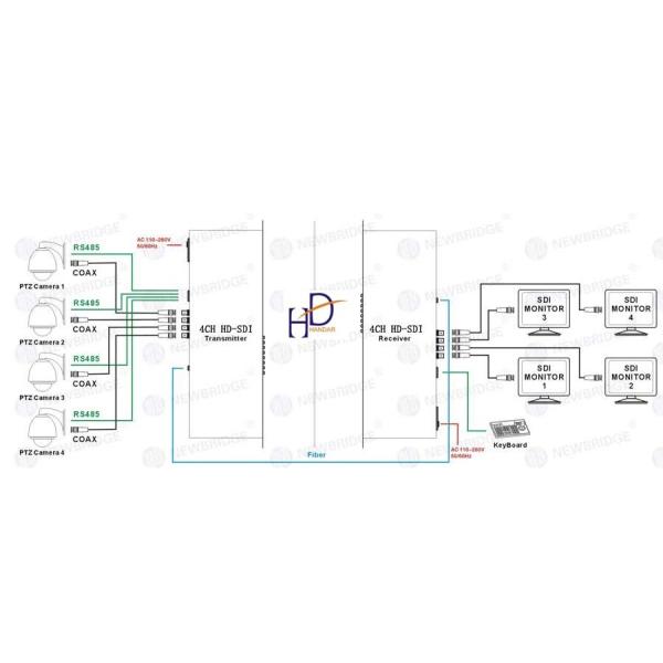 Support SMPTE292M.SMPTE259M.SMPTE424 signal. The device comprise of transmitter and receiver: transmitter convert SDI signal to optical signal; receiver convert optical signal to SDI signal and output.